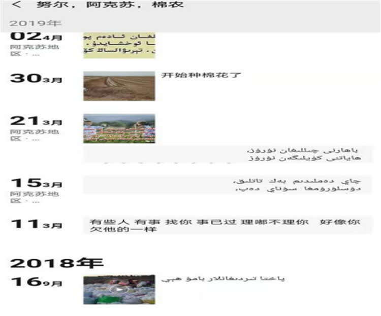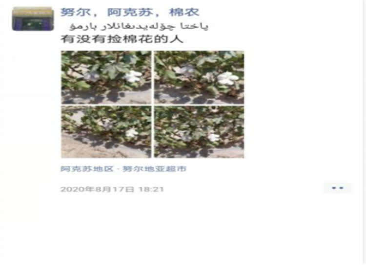 在采访中,课题组成员、西南政法大学人权研究院研究人员张祺乐回忆起一个有趣细节,“这名经纪人在2019年3月发了一条朋友圈:有些人有事找你,事已过,理都不理你,好像你欠他的一样。”这位采棉经纪人告诉张祺乐,在这之前他给别人介绍采棉业务,人家当时特别感激他,到了第二年种棉花的季节,经纪人求这个人来管地,对方却假装不认识他,“这是一个很真切的细节,因为他们的生活都围绕棉花展开,如果存在’强迫‘,又怎么会有这样真实的生活细节呢?”