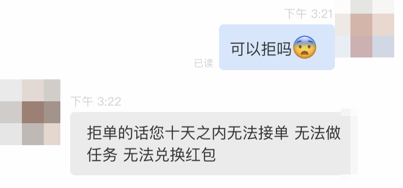 我犹豫了,第一我没有那么多钱,第二我担心骗子要出手“割韭菜”了。此时,派单员告诉我可以降单处理,如果我拒单将十天内无法做任务,我想着2天赚了1100多元,如果10天不接单那不是要少赚很多钱。