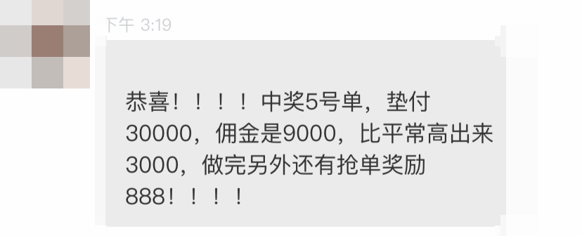 我收到派单员的信息:“恭喜!中奖5号单,垫付30000,佣金9000,比平常高出3000,做完另外还有抢单奖励888!”