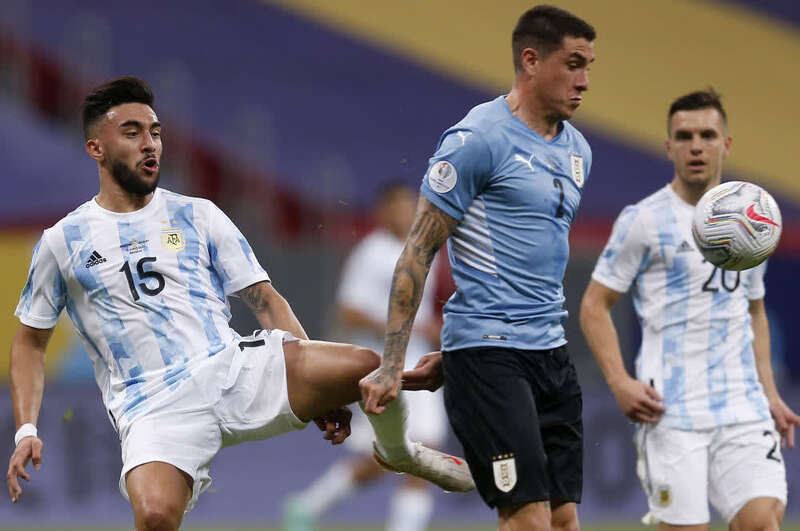 6月18日,阿根廷队球员冈萨雷斯(左)与乌拉圭队球员希梅内斯(中)拼抢。新华社发(卢西奥·塔沃拉摄)