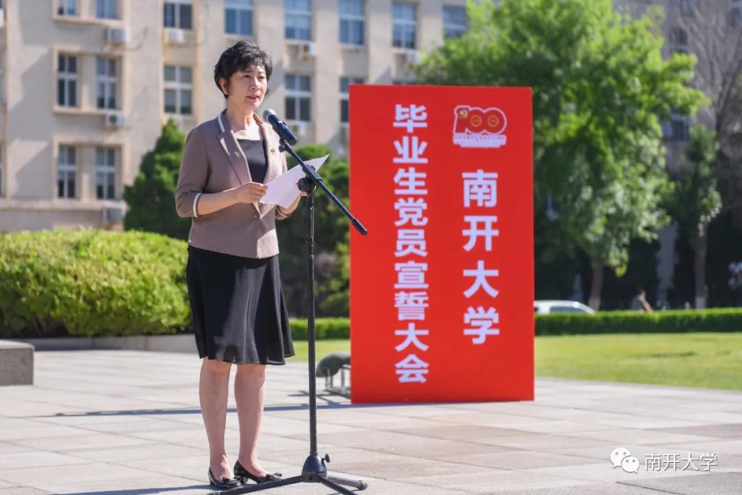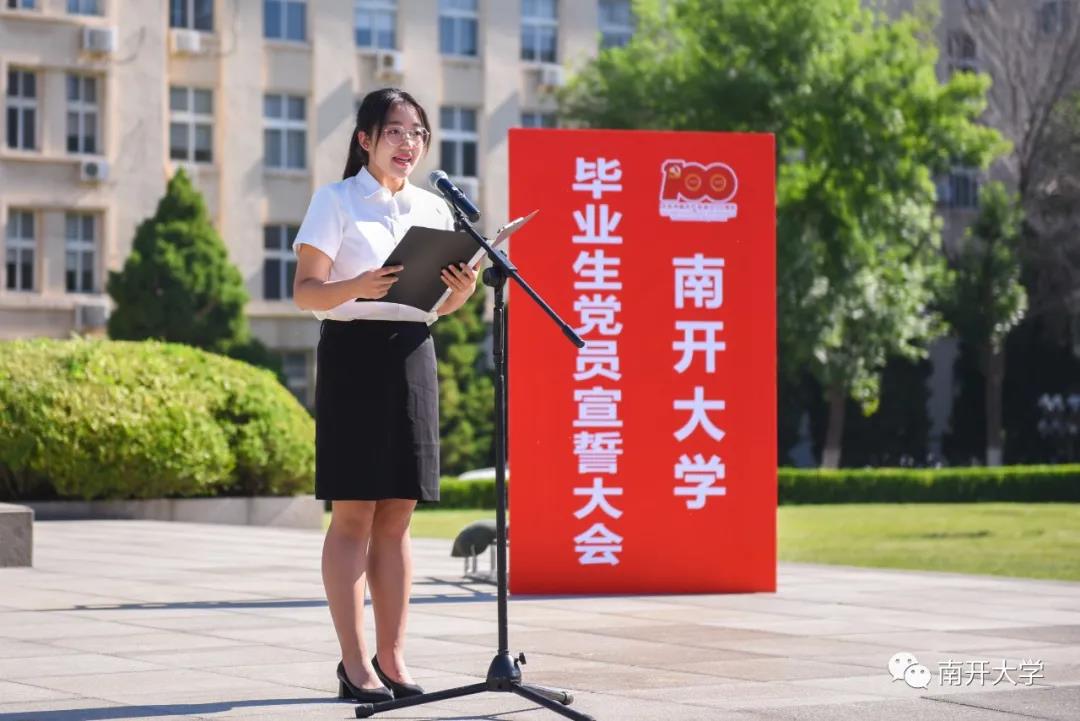 毕业生党员代表、2017级经济学伯苓班本科生张奕涵在发言中,表达了成为一名党员的自豪感和荣誉感。“渴望加入中国共产党,是我一直以来的初心,能够在建党百年之际成为一名党员,这份独特的际遇让我无比骄傲。”她立志成为一名以身作则、躬先表率的合格党员。“我定会在今后的学习生活中发扬蹈厉,践行‘允公允能,日新月异’校训,做一个有理想、有本领、有担当的南开青年。”