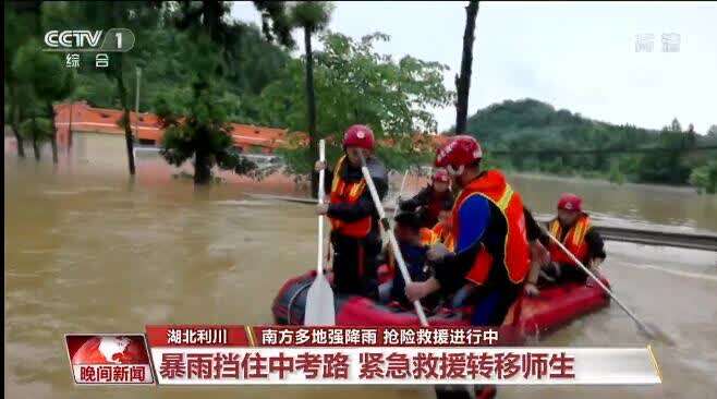 从18日开始,湖北恩施州利川市文斗镇突降暴雨。利川市19日开始中考。18日下午,消防人员接到报警,在文斗镇火石垭村通往城区的道路上,有近400米的路段被洪水淹没,积水最深处达4米。有96名要参加中考监考的老师、9名要参加考试的学生无法通行。救援人员赶到现场驾驶2艘橡皮艇,连续2个多小时往返30多趟,将105名师生全部安全转移。