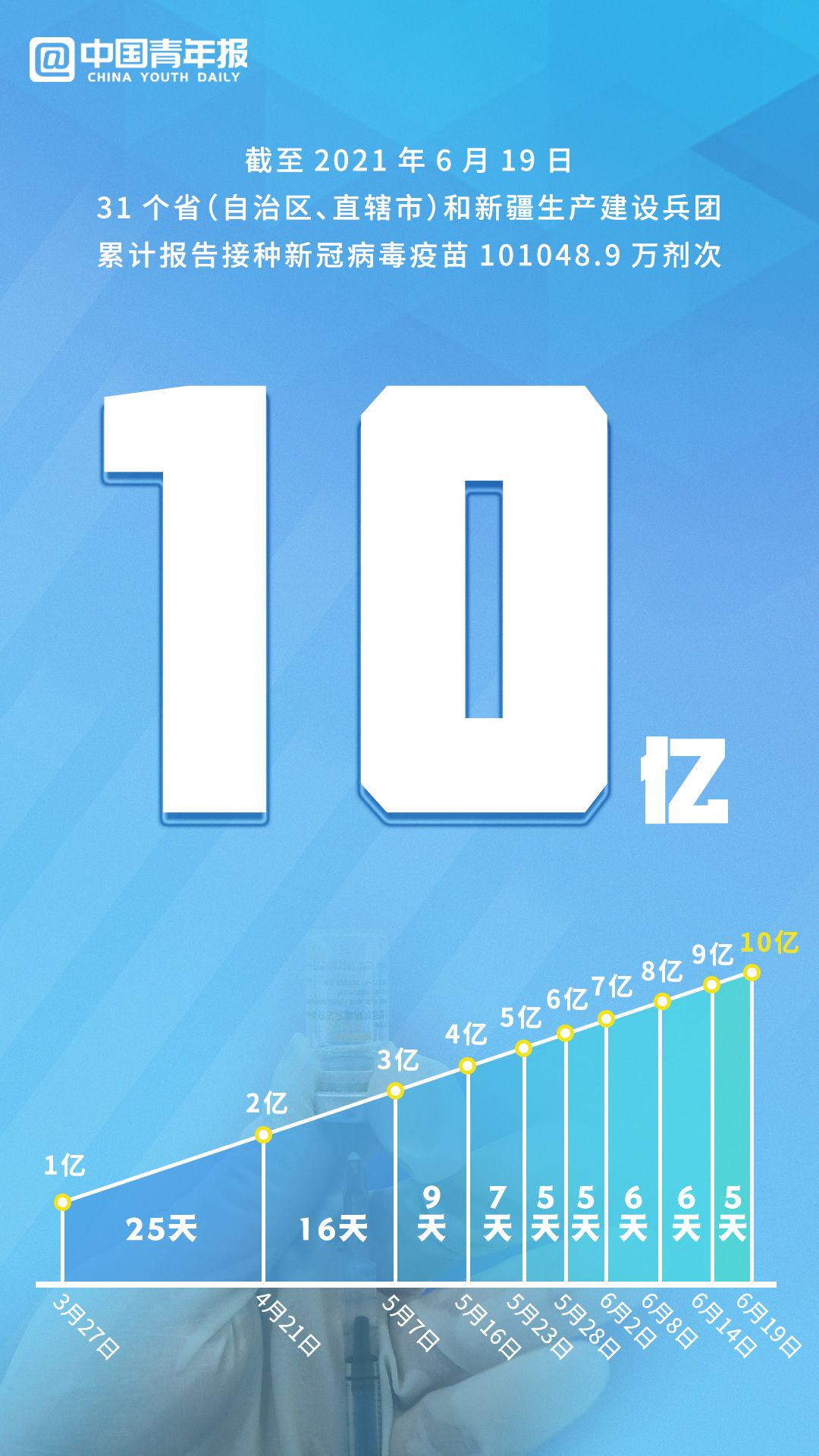 截至2021年6月19日,31个省(自治区、直辖市)和新疆生产建设兵团累计报告接种新冠病毒疫苗101048.9万剂次。加快疫苗接种,共建免疫长城!