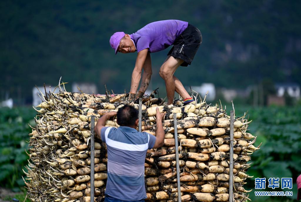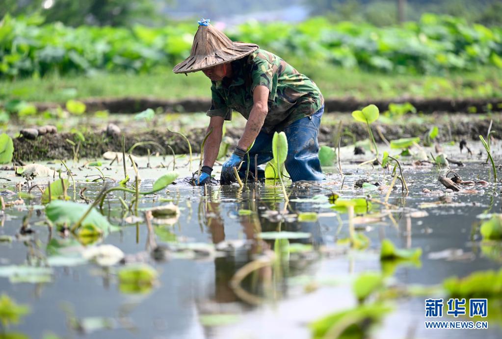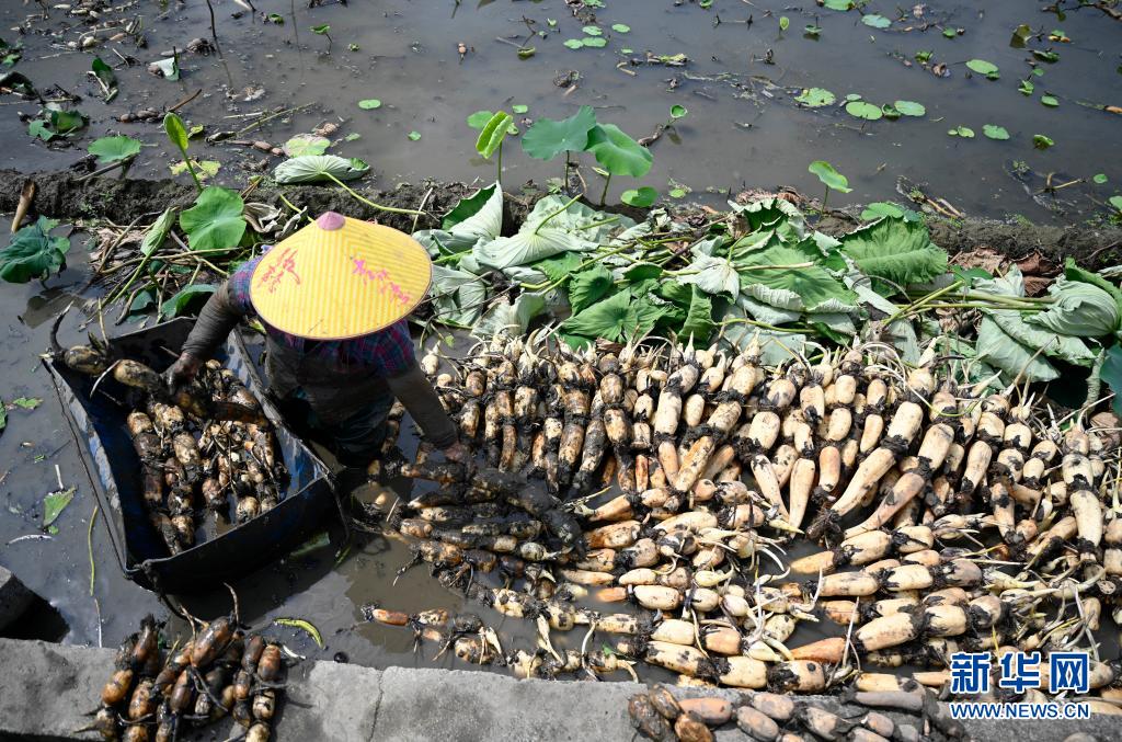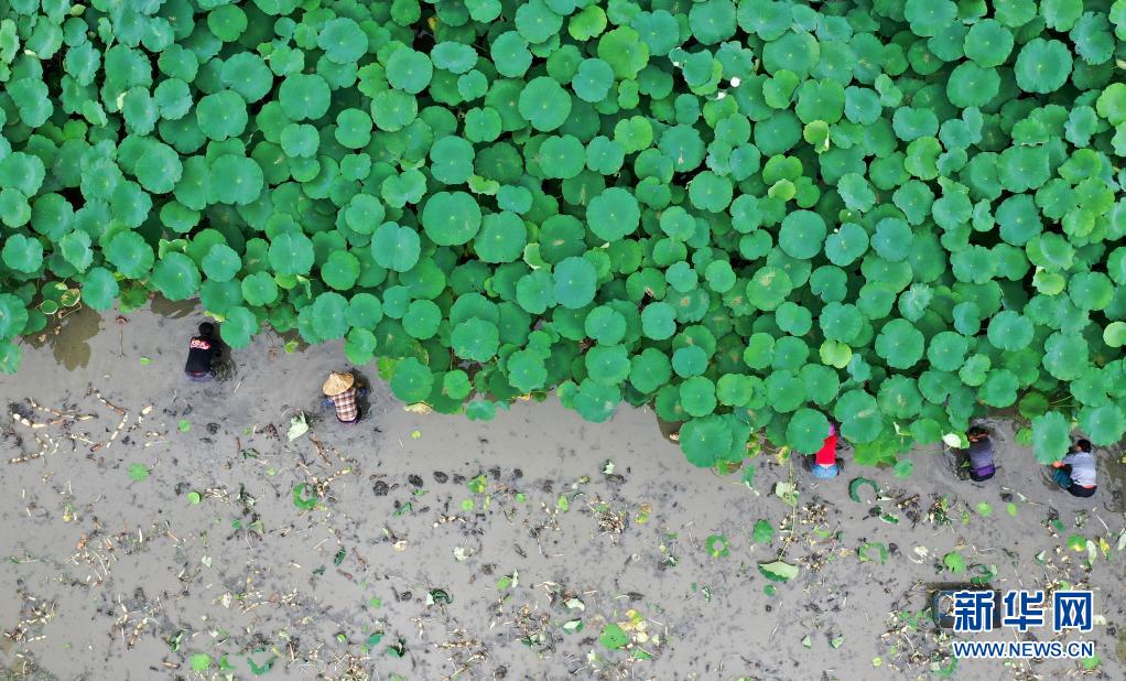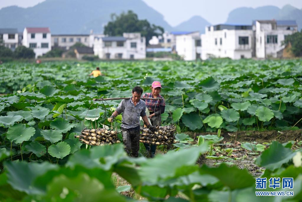 广西柳州市柳江区百朋镇万亩荷塘种植的春季莲藕迎来丰收。连日来,农民紧抓农时,抢收春藕、抢种夏藕,荷塘内一派繁忙景象。