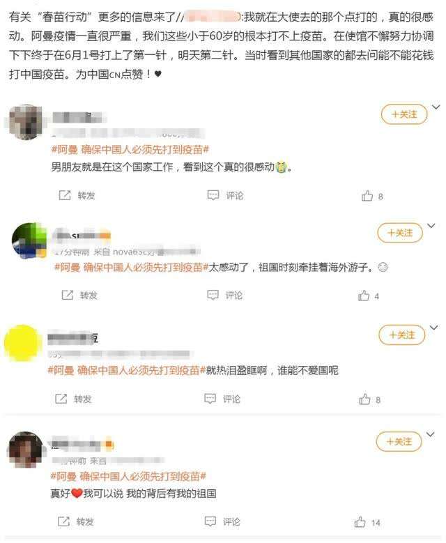 在“阿曼 确保中国人必须先打到疫苗”的热搜词条下面,身在阿曼的网友也分享了自己打疫苗的经过,有家人在阿曼的网友还写下了自己满满的感动以及对祖国的热爱——