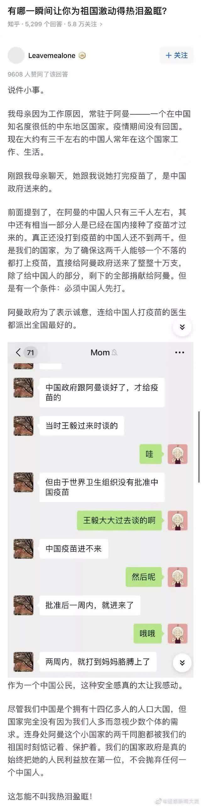 这条热搜的内容来自一位网友,他在“有哪一瞬间让你为祖国激动得热泪盈眶?”的论坛问答下面,分享了他在阿曼工作的母亲讲述其接种新冠疫苗的“小事”。