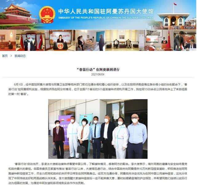据中国驻阿曼使馆网站发布的消息,6月1日,经中国驻阿曼大使馆与阿曼卫生部等相关部门密切沟通协调和精心组织安排,以及在旅阿侨胞疫情应急协调小组的协助配合下,“春苗行动”在阿曼顺利实施,根据我侨民在阿分布情况,位于全国7个省份的9个疫苗接种点顺利开展工作,我在阿1500余名公民率先种上了来自祖国的第一剂“春苗”。