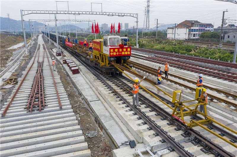2021年6月22日,浙江台州,杭绍台高铁在浙江省温岭火车站无砟道床上顺利对接最后一对长钢轨。