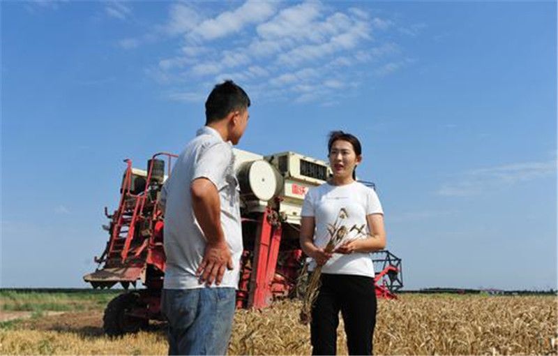 6月22日,张宸在家庭农场麦田向工人了解小麦收割进度。