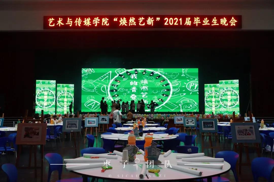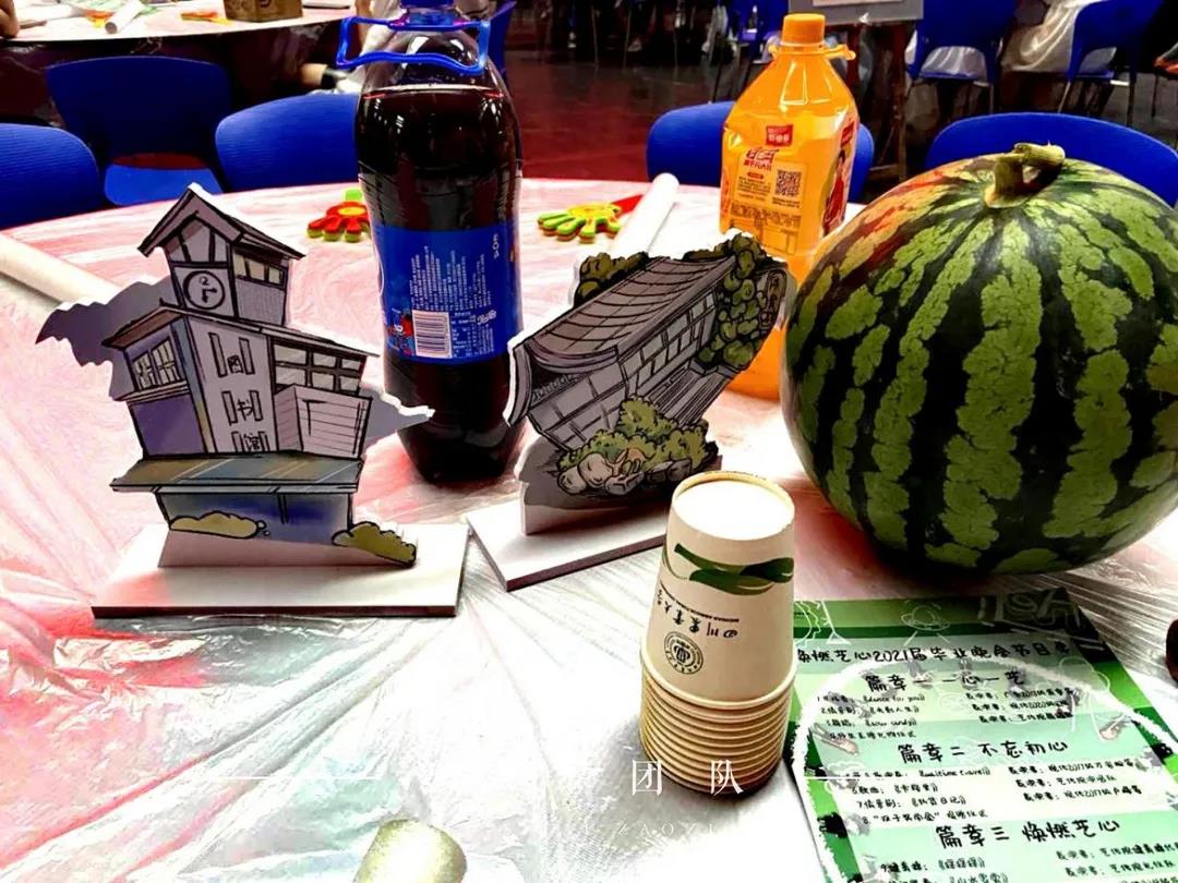 当日晚七点半,艺术与传媒学院的毕业晚会在同学们的期待中拉开帷幕。与常规的晚会不同,本次晚会的座位并不是整齐地摆放在一起,而是模仿了宴席的形式,在场馆内摆放了一张张圆桌,在每张圆桌旁摆放一圈椅子。同时还在桌上准备了四川农业大学的建筑立牌、饮料、应援棒、节目单以及西瓜!
