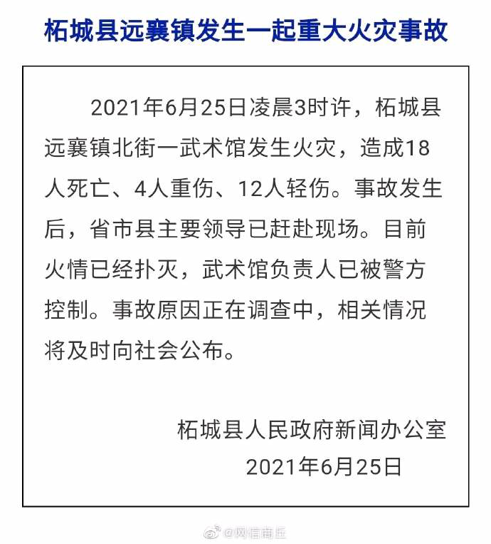 2021年6月25日凌晨3时许,柘城县远襄镇北街一武术馆发生火灾,造成18人死亡、4人重伤、12人轻伤。事故发生后,省市县主要领导已赶赴现场。目前火情已经扑灭,武术馆负责人已被警方控制。事故原因正在调查中,相关情况将及时向社会公布。