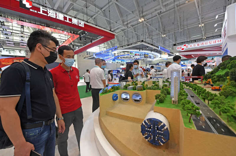 ↑6月24日,在国家会展中心(天津)一期展馆,观众在参观城市地下综合管廊建设模型。