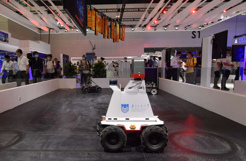↑这是在国家会展中心(天津)展出的自行走小型测量机器人(6月24日摄)。