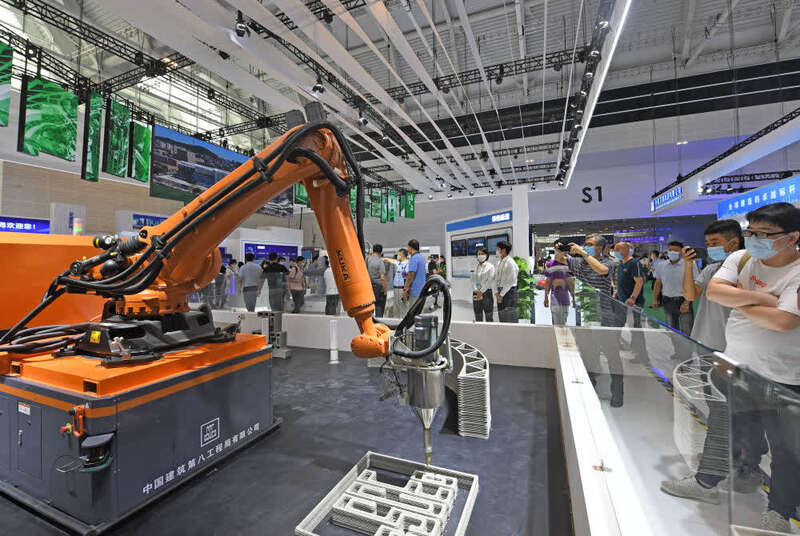 ↑6月24日,在国家会展中心(天津)一期展馆,观众在参观中建八局展厅内的建筑3D打印机器人。