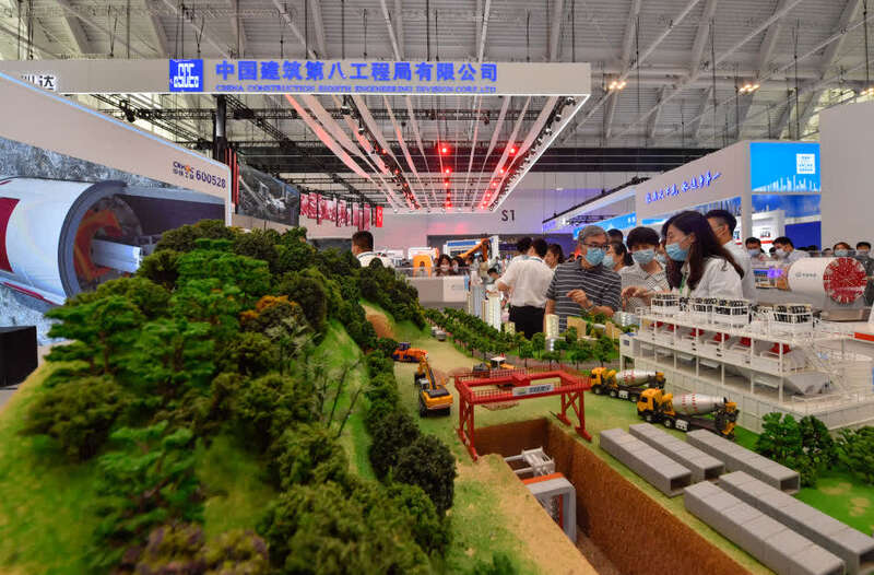 ↑6月24日,观众在国家会展中心(天津)一期展馆内的中建三局展厅参观。