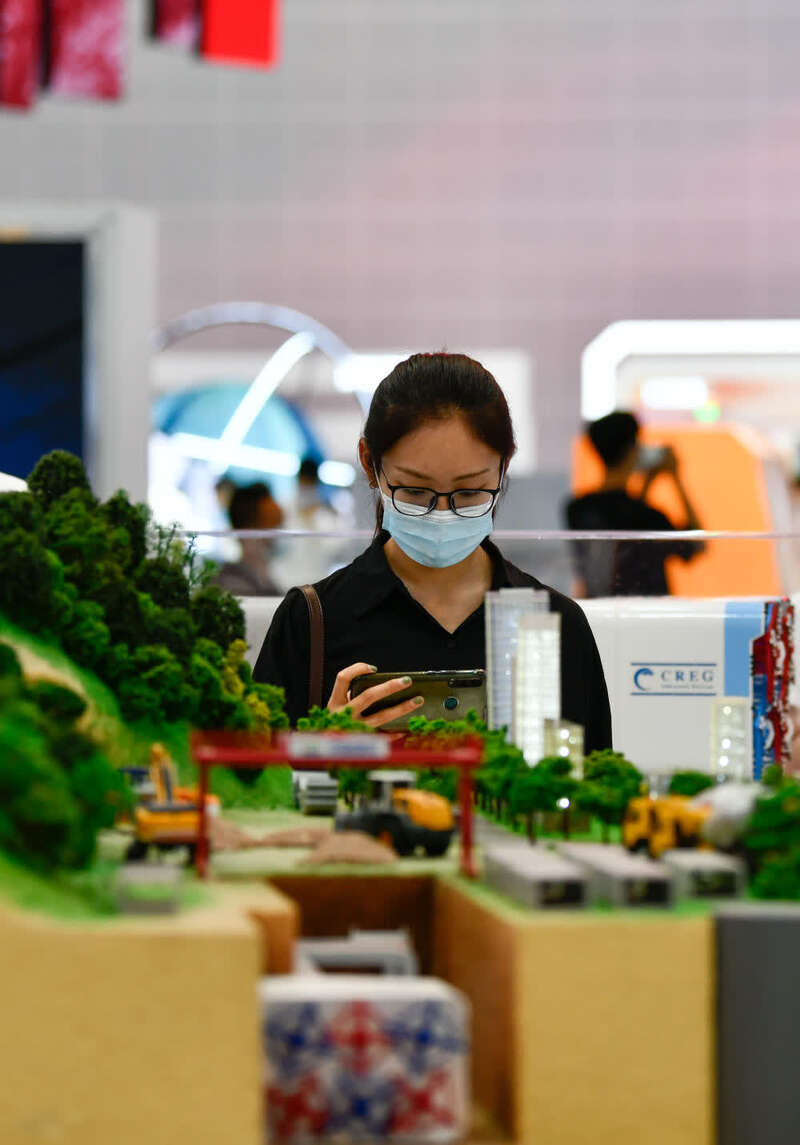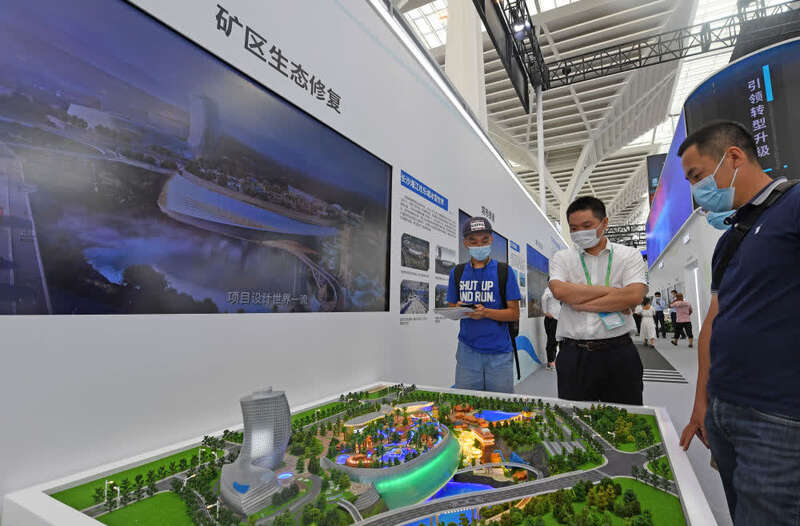 ↑6月24日,在国家会展中心(天津)一期展馆,观众参观矿区生态修复模型。
