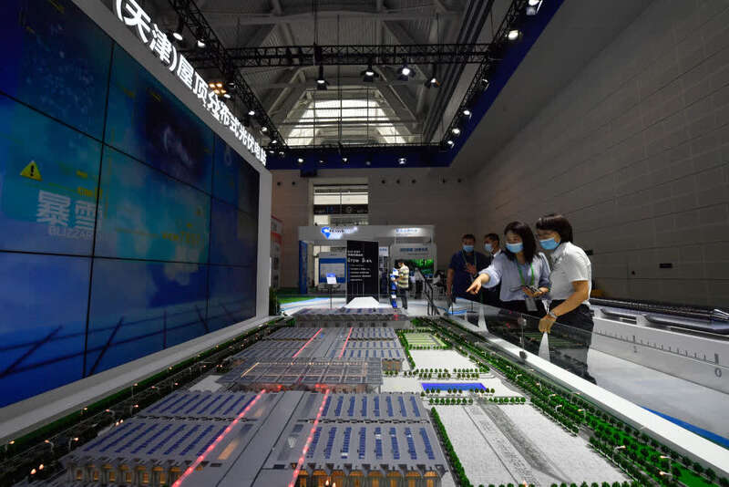 ↑6月24日,观众在国家会展中心(天津)一期展馆内参观国家会展中心(天津)屋顶分布式光伏电站模型。