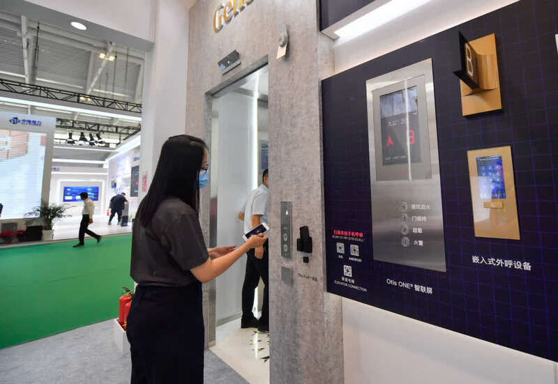 ↑6月24日,在国家会展中心(天津)一期展馆,工作人员操作演示无接触式智能化电梯。