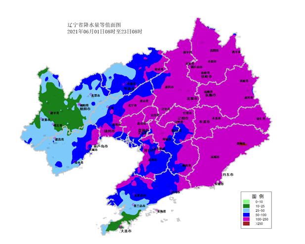 数据分析显示:2021年6月1日至6月24日,辽宁省平均降水量103.5毫米,比常年(64.4毫米)偏多6成,比去年同期(30.6毫米)偏多2.4倍,为1951年有完整气象资料以来第六多值。大连南部、锦州西北部、朝阳和葫芦岛西北部偏少1~8成,其他大部地区均偏多,其中大洼和康平分别偏多1.8和1.9倍。