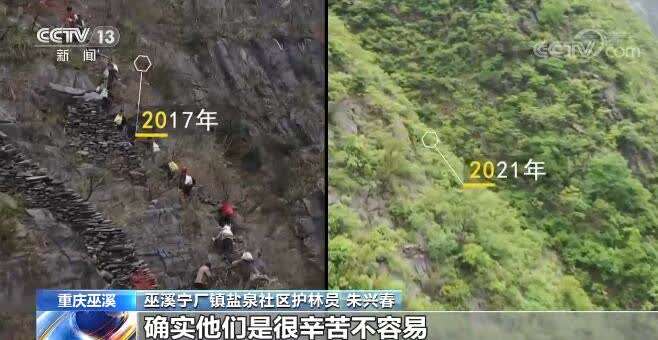 这是2017年记者在重庆巫溪宁厂古镇记录下的场景。为了在这片已经荒漠化的石头山上种树,官山林场工班长林云喜和工友们肩背手提,先是把水泥、石块、泥土运上峭壁筑成一个个石窝子,再把树苗一棵棵背上山,种在石窝子里。