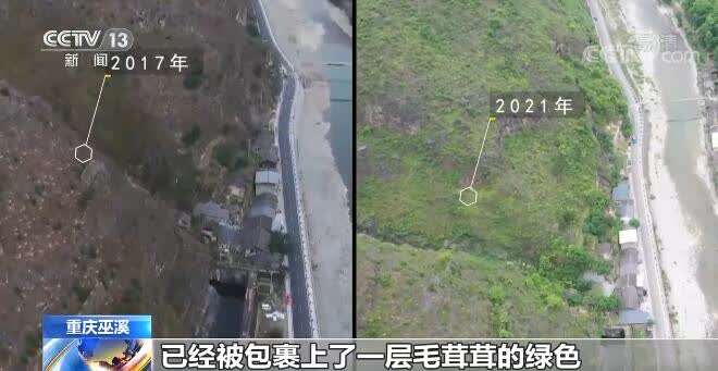 总台记者 王磊:四年以后,我再次回到宁厂古镇,发现这里的变化让人震撼。记得当年我就是爬上身后这座石头山见证了林云喜他们种树的艰辛,功夫不负有心人,现在我们可以看到山体上包裹上了一层毛茸茸的绿色。在山脚下就是长江的一级支流大宁河,记得以前有很多泥沙,现在即使是昨晚刚下过暴雨,河水仍然是很清澈的。