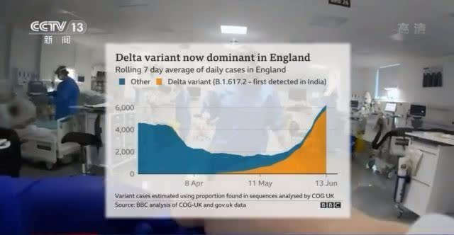 6月25日,英国公共卫生部表示,在过去一周的新增确诊病例中,因感染“德尔塔”毒株致病的占到96%,而此前一周这一比例更是达到99%,全英因“德尔塔”毒株致病的累计人数已达到111157人。