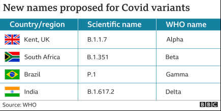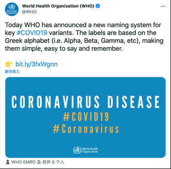 今年5月,世卫组织为避免与特定国家相关的污名化、且方便使用,宣布采用希腊字母命名各国发现的变异毒株。