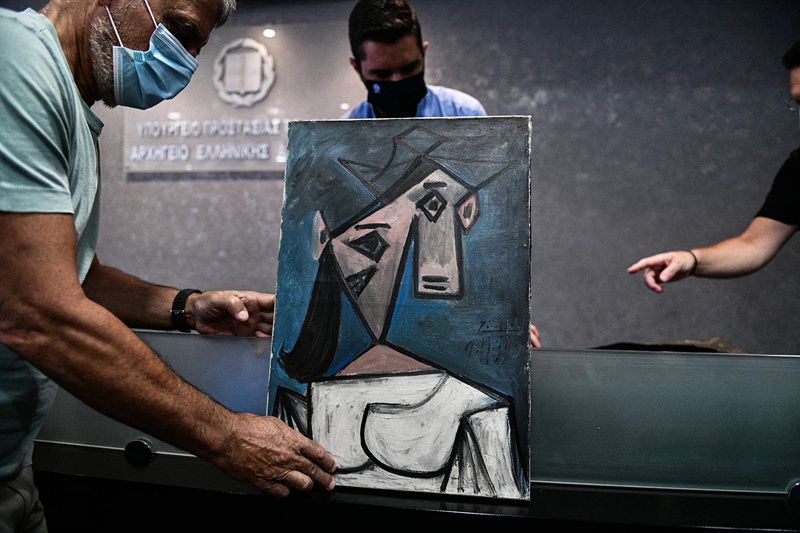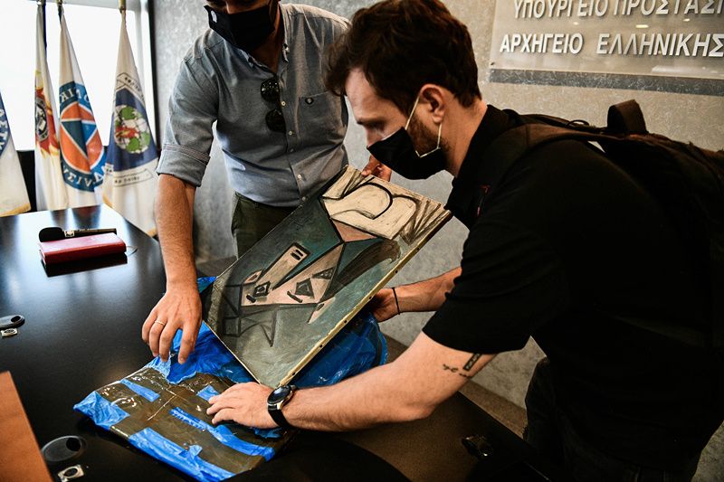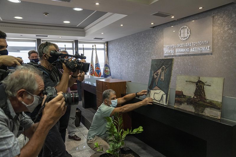 当地时间2021年6月29日,希腊雅典,当地官员公布毕加索的画作失窃案细节。28日,希腊当局表示,警方已经找到2012年从希腊国家美术馆被偷走的西班牙画家毕加索的画作,并逮捕一名偷画嫌犯。
