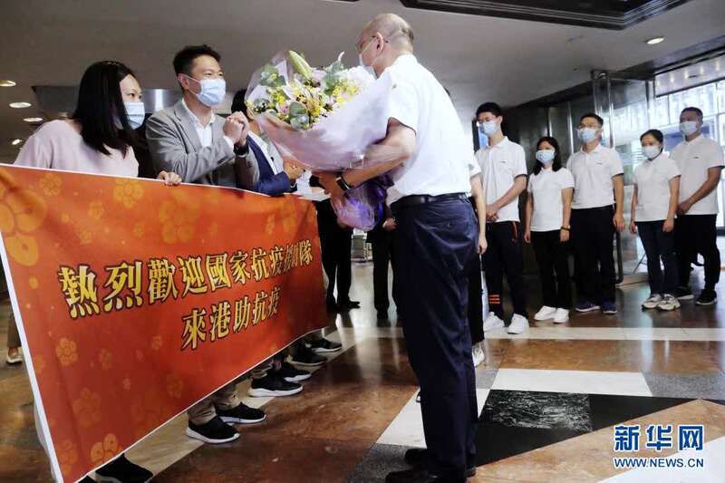 香港市民代表在香港九龙维景酒店欢迎内地核酸检测支援队抵港(2020年8月21日摄)。新华社记者 王申 摄