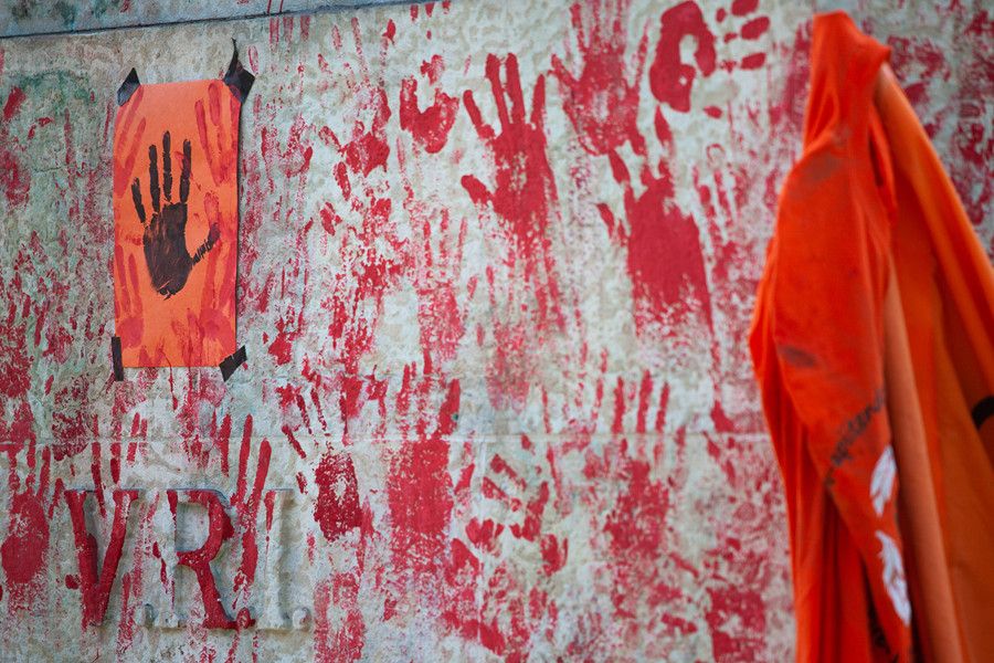 当地时间2021年7月2日,加拿大中南部城市曼尼托巴,抗议者聚集在省议会大楼前,用推翻雕像的方式纪念被害的原住民儿童。被推倒的维多利亚女王的雕像和底座上印上了许多红色油漆手印,并留下一个写有“我们曾经是孩子、让他们回家”的标牌。