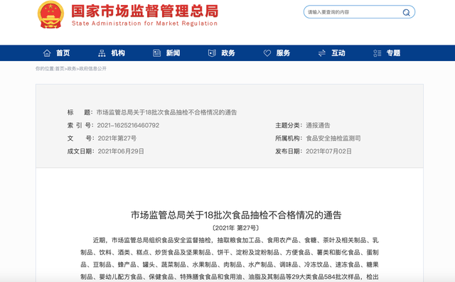 据市场监管总局官网最新发布,近期,市场监管总局组织食品安全监督抽检,检出食用农产品、酒类、炒货食品及坚果制品等10大类食品18批次样品不合格。