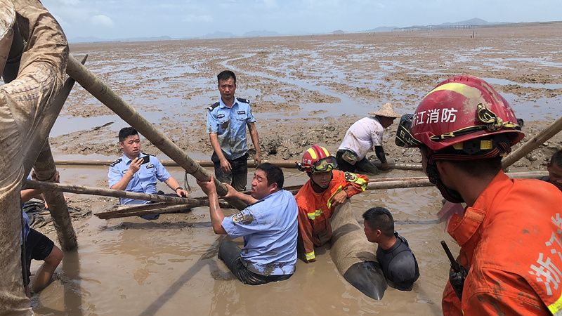 2021年7月6日,浙江台州,12头鲸鱼在头门港滩涂上搁浅。市民、民警和消防等百名救援力量在现场紧急营救。