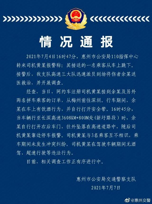 2021年7月4日16时47分,惠州市公安局110指挥中心转来司机黄某报警称:其接送的一名乘客从车上跳下。接警后,我支队高速三大队迅速派员到场将伤者余某送医救治,并开展调查。