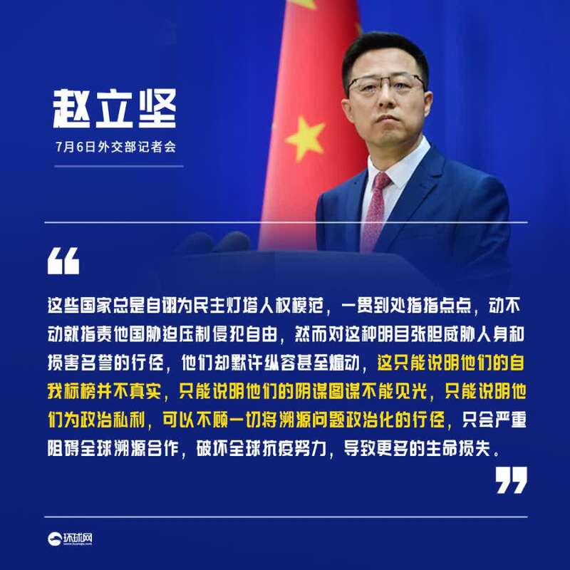 赵立坚表示,这些国家总是自诩为民主灯塔人权模范,一贯到处指指点点,动不动就指责他国胁迫压制侵犯自由,然而对这种明目张胆威胁人身和损害名誉的行径,他们却默许纵容甚至煽动,这只能说明他们的自我标榜并不真实,只能说明他们的阴谋图谋不能见光,只能说明他们为政治私利,可以不顾一切将溯源问题政治化的行径,只会严重阻碍全球溯源合作,破坏全球抗疫努力,导致更多的生命损失。