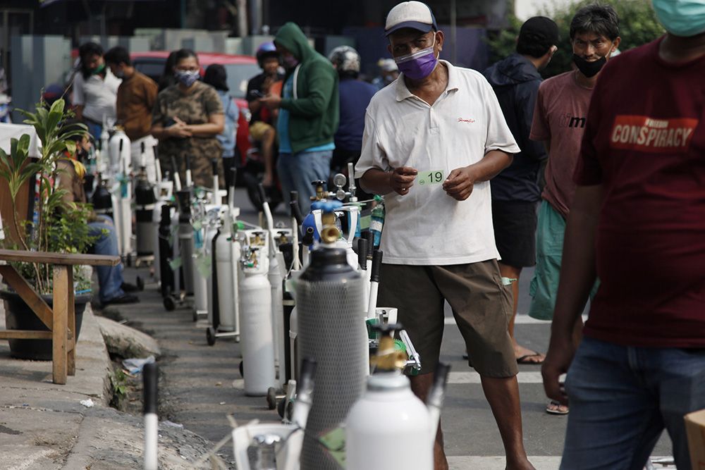 当地时间2021年7月5日,印尼雅加达,市民排队给氧气瓶充氧。人民视觉 图