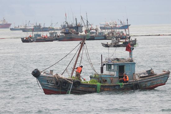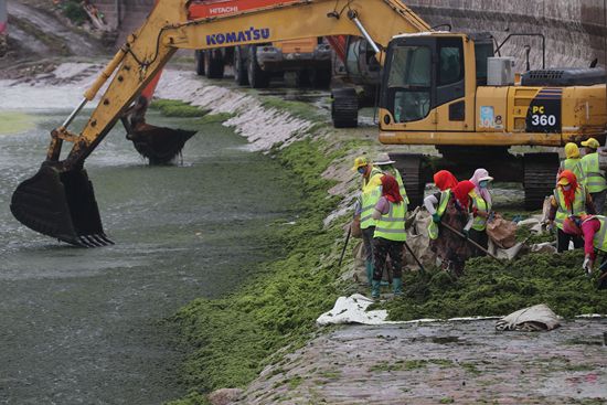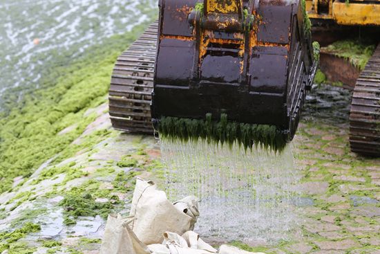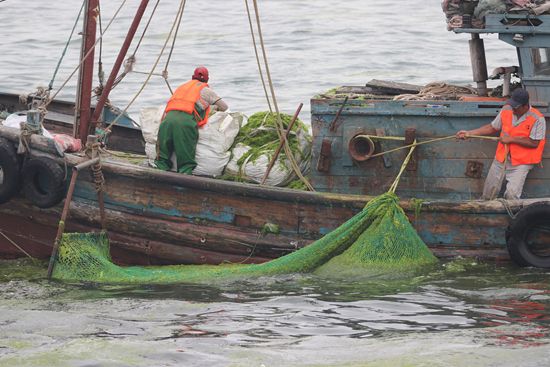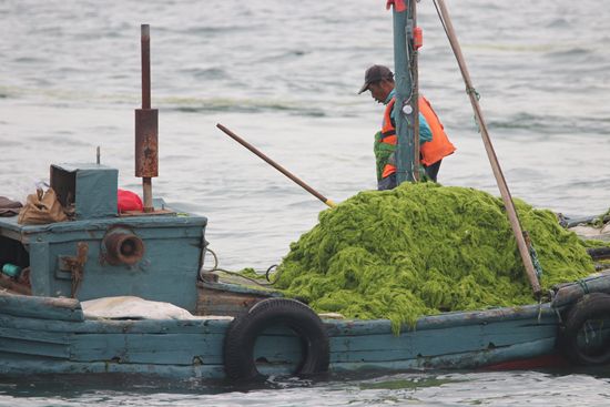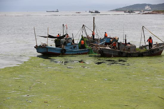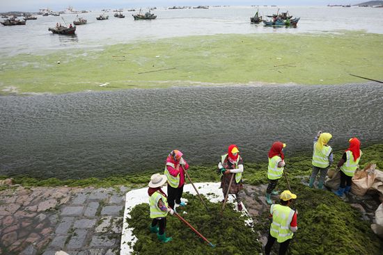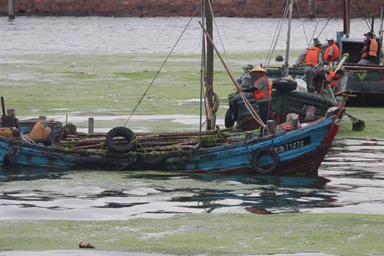 2021年7月7日,工人在青岛团岛湾打捞浒苔。