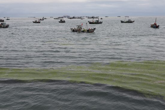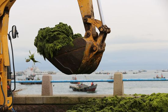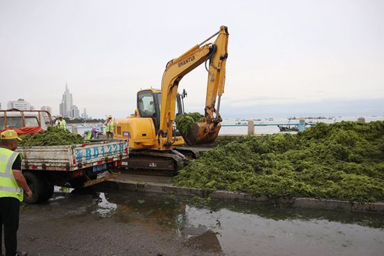 连日来,大规模浒苔绿潮持续袭击青岛沿海,相关部门组织大量渔船、工程车辆及人员不间断清理,海上陆地齐“打浒”,以减轻对岸线冲击。自2007年以来,浒苔绿潮已连续15年侵袭青岛。