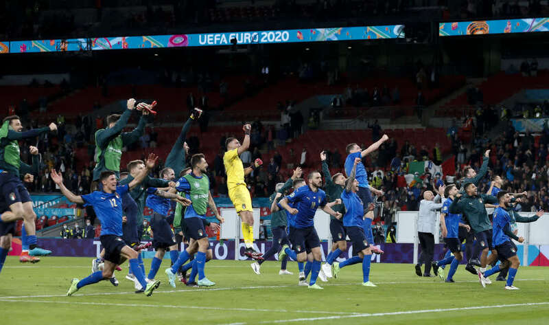 7月6日,意大利队球员在赛后一起跑向场边庆祝胜利。新华社记者韩岩摄