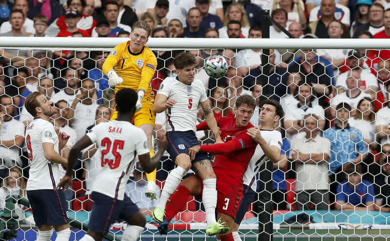 7月7日,在英国伦敦进行的欧洲足球锦标赛半决赛中,英格兰队通过加时赛以2比1战胜丹麦队,晋级决赛。图为英格兰队门将皮克福德(上左一)在门前扑救。新华社记者韩岩摄