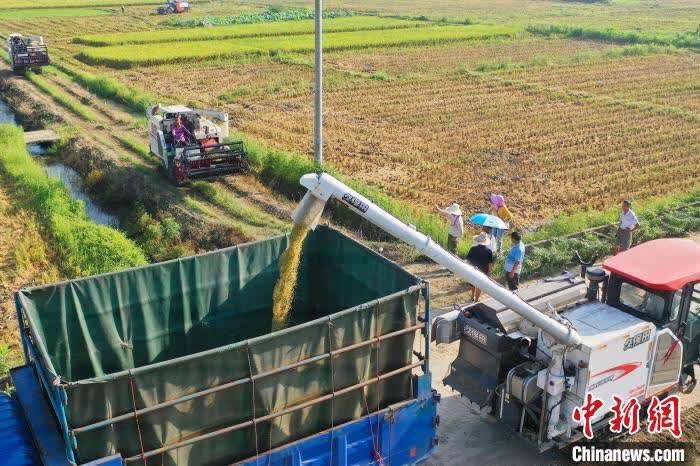 7月10日,江西省宜春市上高县新界埠镇洲上村村民在收割早稻,农田一派忙碌景象。眼下,早稻逐渐进入收割期,该县各地农民趁晴好天气,抢收早稻,确保颗粒归仓。