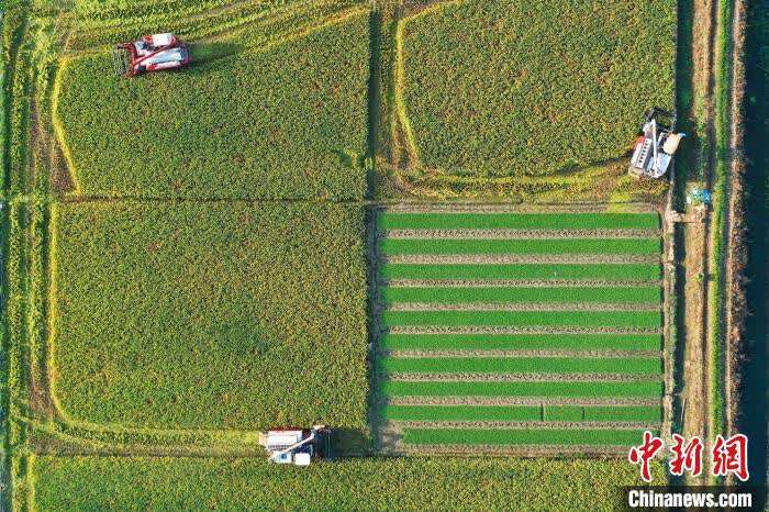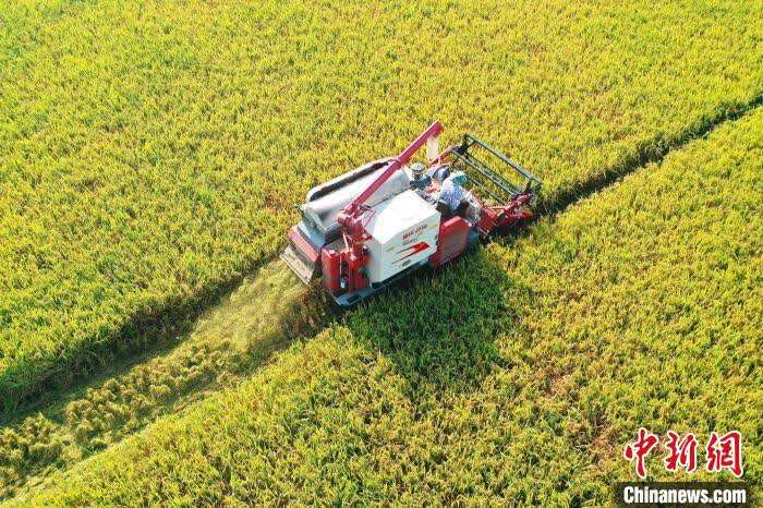 当地农民趁着晴朗天气,正在进行机械收割。 陈旗海 摄