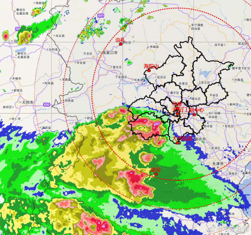 7月11日19时左右,房山、门头沟和丰台西南部已出现雷阵雨。(图源:北京市气象局)