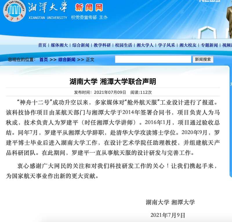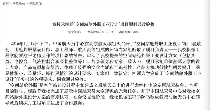 澎湃新闻注意到,湘潭大学官网至今有两则新闻,2014年2月21日,湘潭大学机械工程学院中标“空间站舱外服工业设计项目”,这是该院“在国家载人航天工程中承担的首个科研项目”。