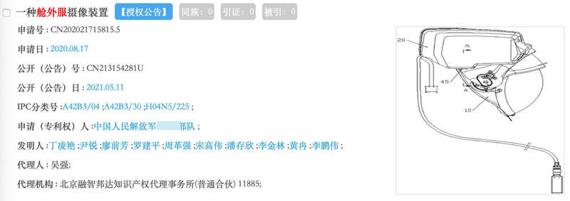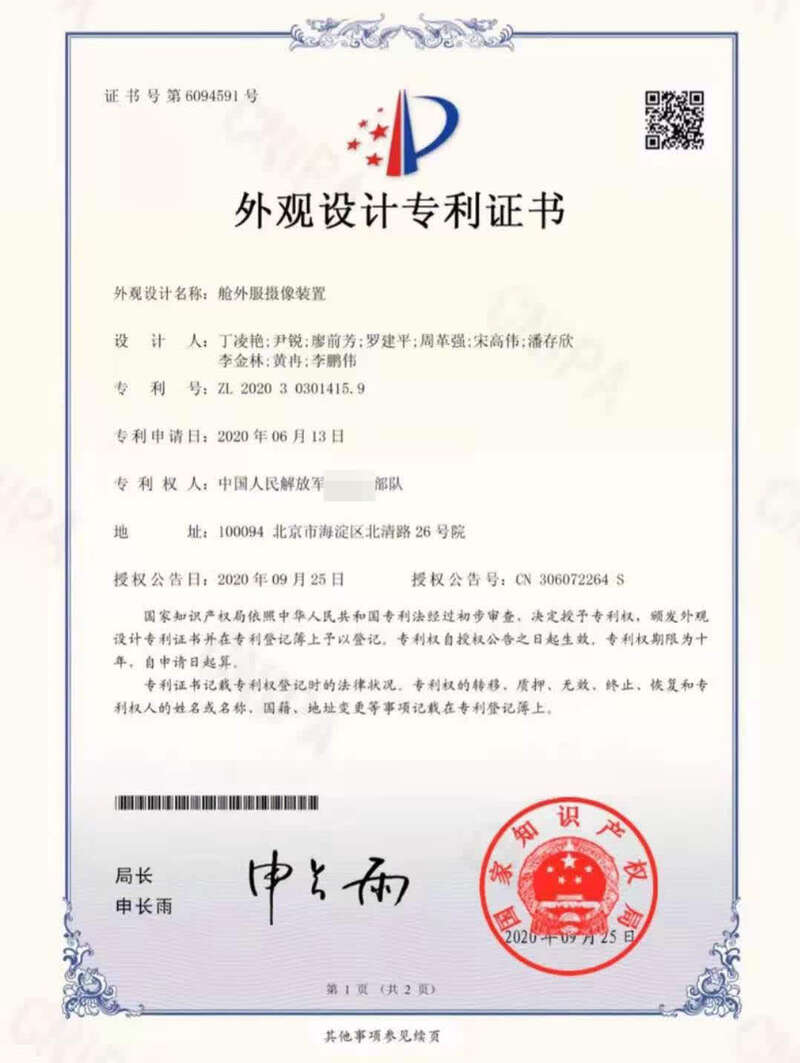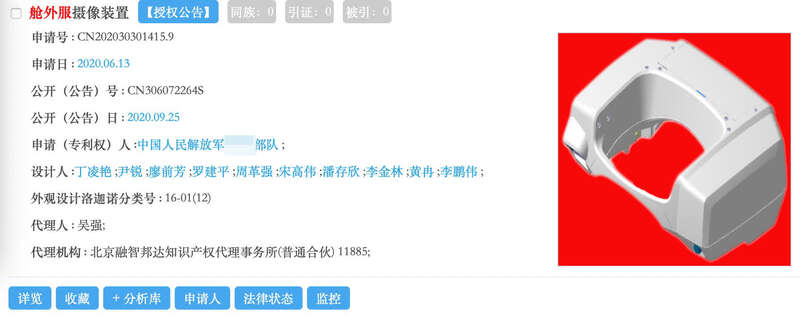 澎湃新闻检索国家知识产权局官网发现,以“舱外服”为关键词的授权专利仅三项,其中一项“刚柔混合的舱外服下肢助力装置及助力方法”,权利人为北方工业大学,另外两项名为“舱外服摄像装置”的实用新型专利和外观设计专利,其专利权人均为中国人民解放军某部队(中国航天员科研训练中心),发明人为包括了罗建平在内的10人。该两项专利的申请时间均为2021年1月。