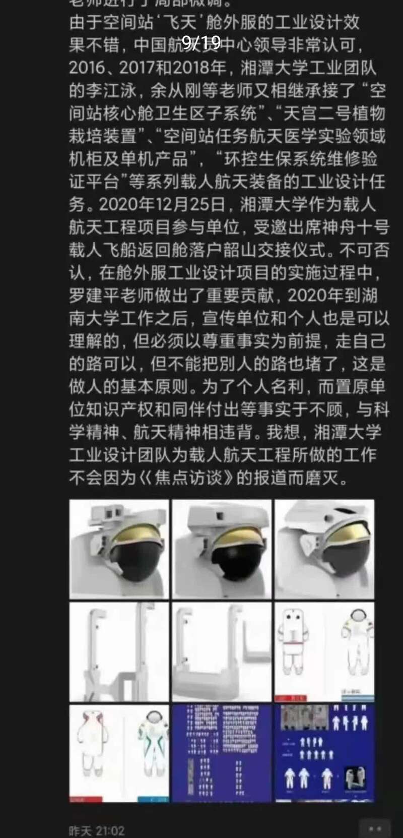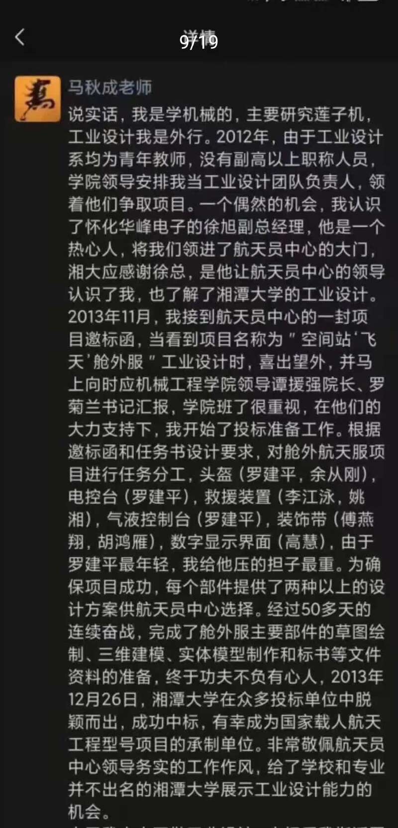一则湘潭大学机械工程学院马秋成教授的朋友圈截图,将这则“湖大设计舱外服”的新闻报道推上风口浪尖。