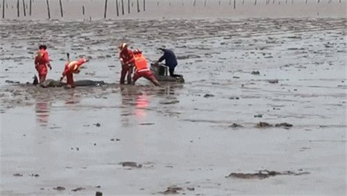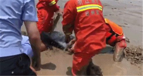 继7月6日在浙江临海头门港搁浅12头瓜头鲸后,7月11日12时03分,浙江省台州温岭市消防救援大队接到报警称:温岭市东部新区东海塘,两头鲸鱼搁浅,接警后,消防救援部门出动6辆消防车29名消防员赶赴现场救援。