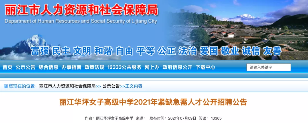 7月9日,云南省丽江市人力资源和社会保障局官网发布公告,丽江华坪女子高级中学面向全国招聘紧缺急需专业技术人才18名。该公告经共青团中央、人民日报等转载后,受到社会关注。