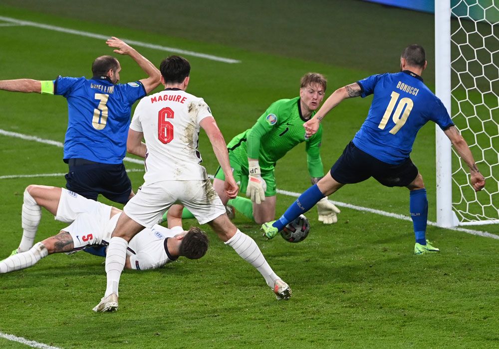 90分钟的常规赛是这出大戏的铺垫部分。英格兰大举压上打响闪电战,卢克·肖的进球让“主队”在1分57秒便获得领先,全队随后转入防守反击状态;意大利队面对“客场”落后困境一次又一次冲击英格兰防线,第66分钟终于由中卫博努奇在角球引发的禁区混战中将比分扳平。