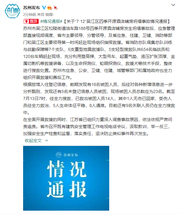 @苏州发布今日发布关于“7·12”吴江区四季开源酒店辅房坍塌事故情况通报。