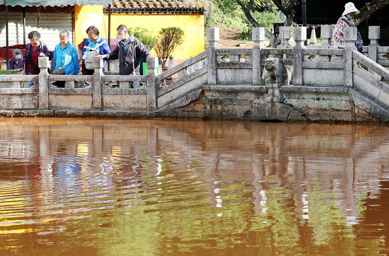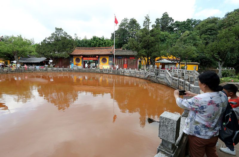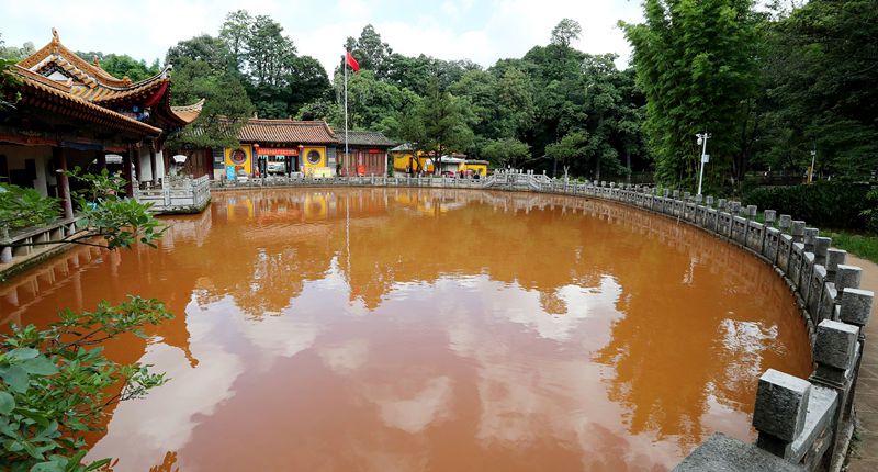 2021年7月13日,昆明,实拍黑龙潭公园清水变成红色,像极“南瓜汤”。